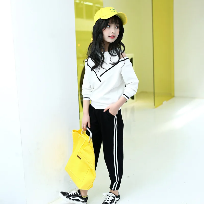 Discount Fashion Big Girls Sports Suits Off Shoulder Black and White Clothing Set for Teenage Autumn Tracksu